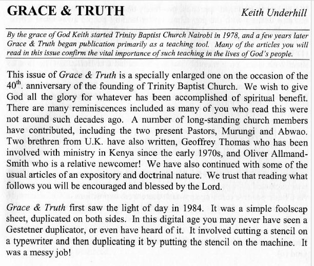 This is my personal website. With my family, I spent 40 years serving the Lord in the gospel in Kenya, East Africa. During those years churches were planted and resources were made available, and the contents of the website are the fruit. You will find up to date information about some of the Reformed Baptist Churches in Kenya and Ethiopia for thanksgiving to God and prayer, and you will be able to look at the resources which I trust will be of spiritual value.